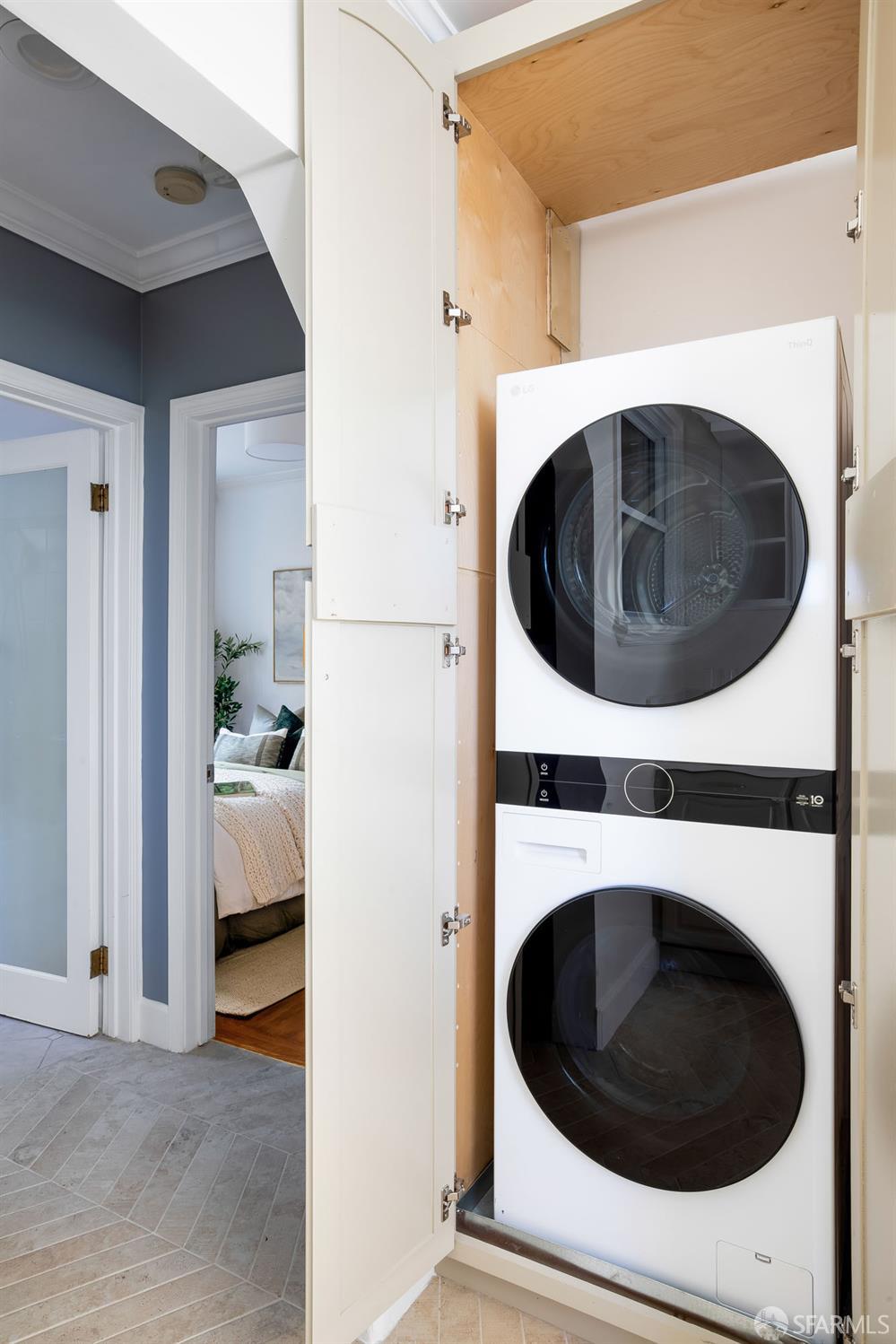 This home with a freshly remodeled kitchen and in-unit laundry is situated on one of Noe Valley's most charming streets. The recently updated kitchen anchors the home with travertine floors, updated stone counters, and a new in-unit washer and dryer. Refreshed lighting and an updated bathroom further brings the home into the 21st century, while the original hardwood floors, large windows, and arched doorways reflect the home's historical roots. Detached on 3 sides, this home is light, bright, and surrounded by greenery, from the mature street trees to the well landscaped backyard. The two-unit building has undergone substantial HOA upgrades that amount to a complete envelope refresh, including a new deck that offers peeks of the Bay. Easily walkable to the bustle of 24th street, 8 Fountain enjoys an enviable location with a village-like feel.