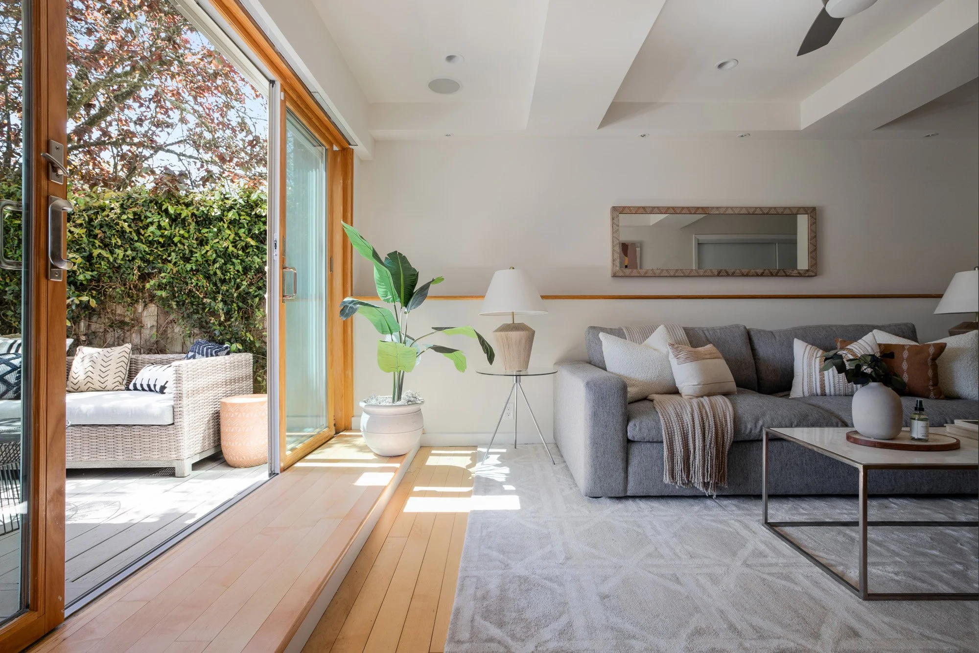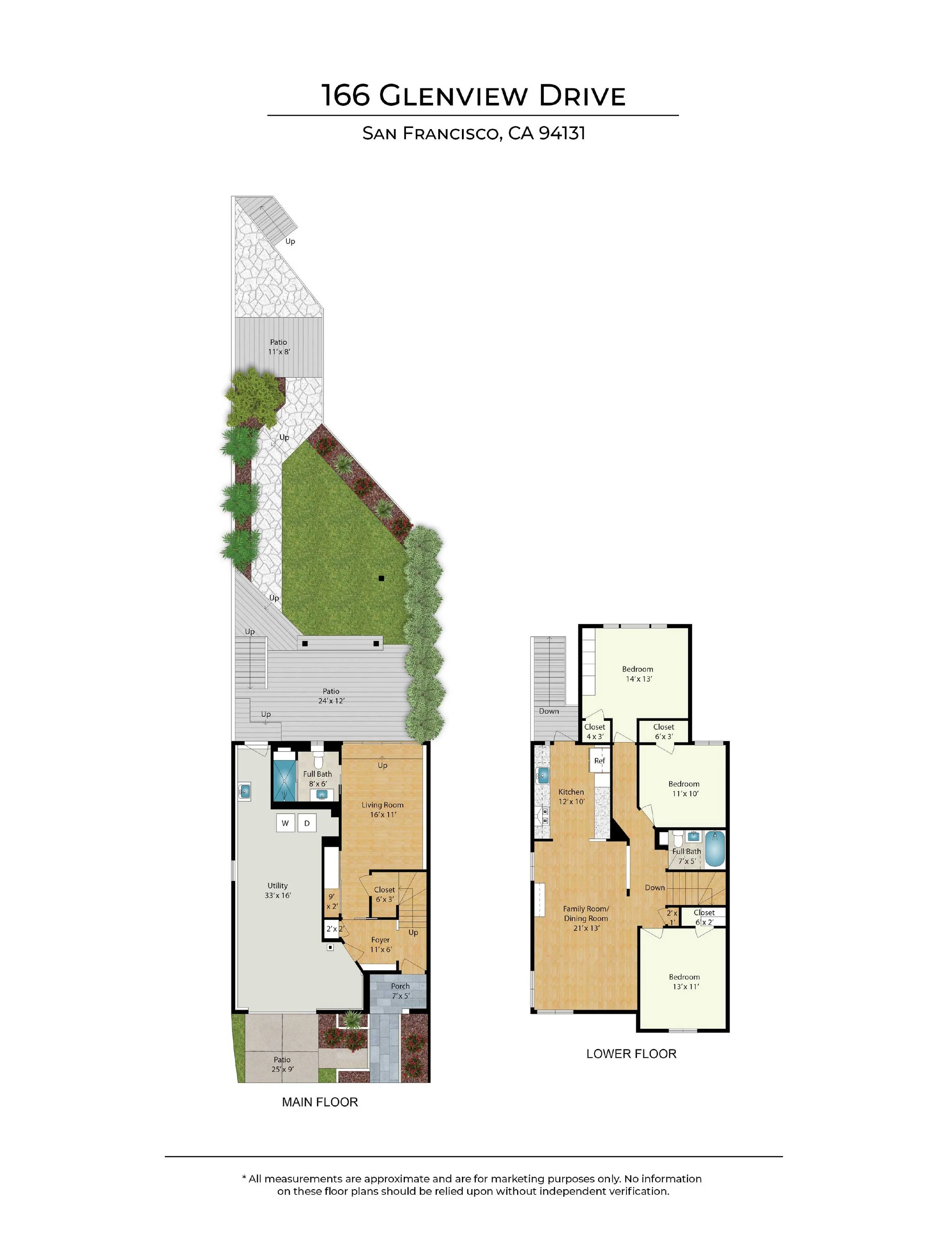 On a large, sunny corner of Twin Peaks' south slope, this tastefully updated mid century home offers a quiet retreat. Large windows make the most of the corner lot, drenching the elevated main level in light from three sides and offering peeks of Glen Canyon and the San Bruno Mountains from the rear bedroom. Two additional bedrooms and a fresh bathroom with soaking tub and natural stone tile balance out an open floor plan that makes entertaining easy, with a large kitchen featuring Silestone counters and Viking range, new dishwasher, and access to the yard. The first floor grants the home a great deal of flexibility with a large primary suite that can also double as a media room, guest space or office. It features sliding doors that open to the deep rear yard, covered patio and also has direct access to the street via a garden gate. Both front and rear yards were professionally designed and maintained, and highlight the extra-deep lot, while a long driveway provides easy parking for a second vehicle. Storage, washer and dryer, solar inverter and a Tesla powerwall are tucked into a recently epoxied garage.