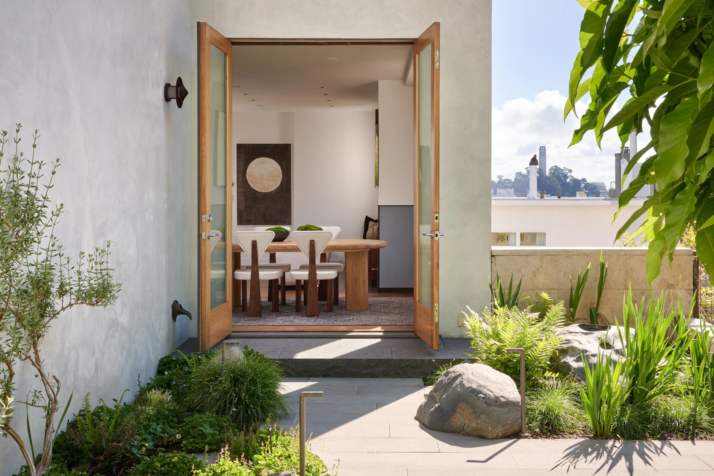 The main level is defined by expansive, generous spaces oriented around unobstructed panoramas of the Bay Bridge, Coit Tower, Fisherman's Wharf, and the city. On the western end, an open kitchen handcrafted in Australian lacewood opens directly to an outdoor kitchen on one side, and flows naturally into the family living and dining areas on the other. On the eastern end, formal living and dining spaces frame sweeping Bay views through walls of glass, with folding doors dissolving the boundary between indoor and outdoor living. Over 3,000 square feet of private, landscaped grounds unfold over a series of terraced gardens complete with custom Yuba River boulder sculptures by artist Jesse Schlesinger.